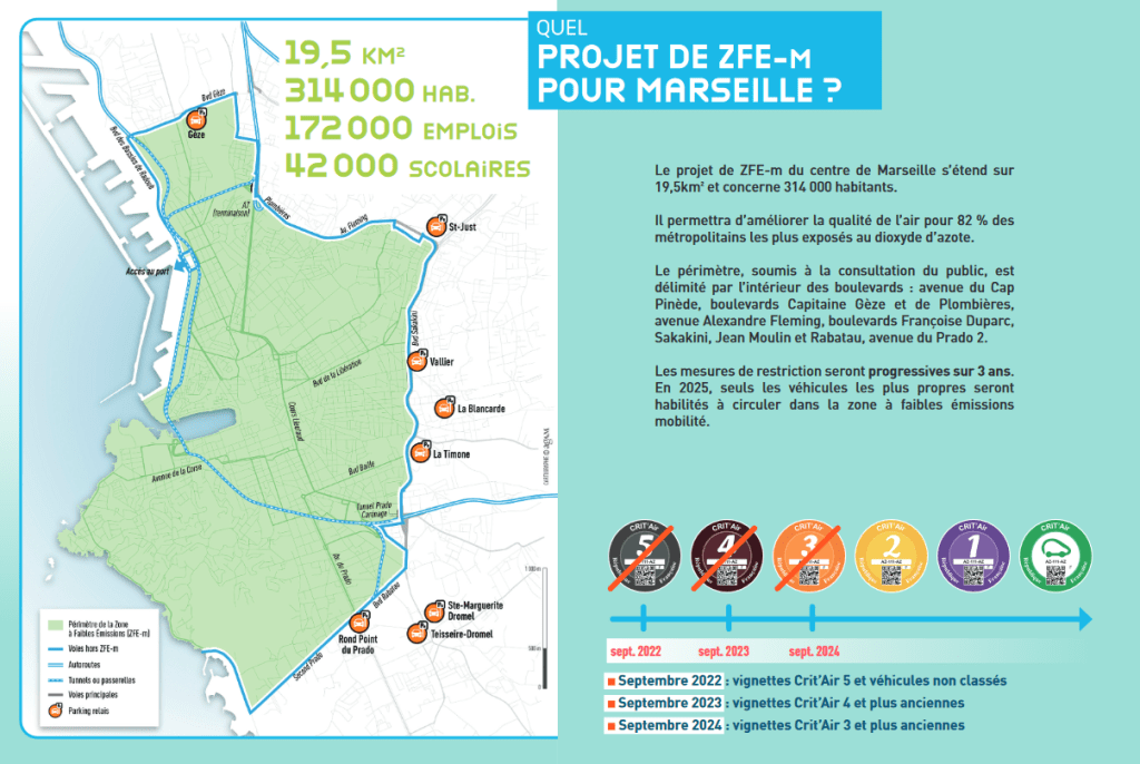Dès septembre 2022, une ZFE-M (zone à faibles émissions mobilité) va créer à Marseille un périmètre dans lequel les véhicules les plus anciens et les plus polluants n’auront plus le droit de circuler (interdiction progressive en fonction de la catégorie de véhicule, de 2022 à 2024). Si ce dispositif qui veut diminuer la pollution pour améliorer la qualité et l’espérance de vie, est louable et souhaitable, la forme proposée par la Métropole Aix Marseille n’est néanmoins pas satisfaisante.